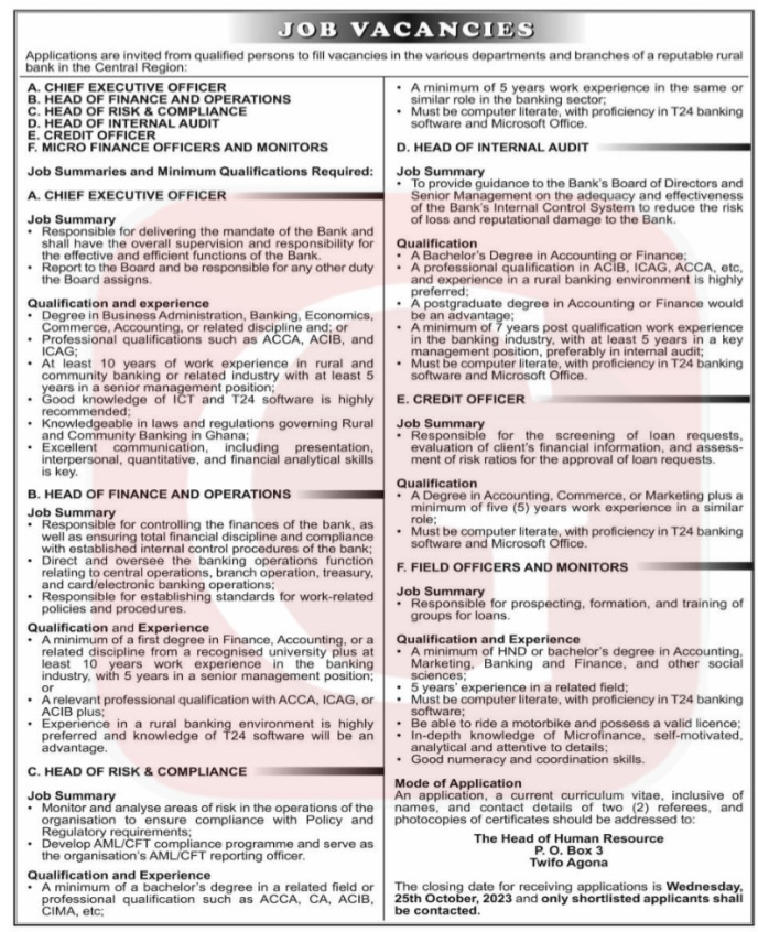 Prospective job seekers can find below the advertised jobs in the October 13, 2023, edition of Daily Graphic as published in the paper today.