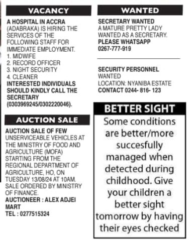 Prospective job seekers can find below the advertised jobs in the August 9, 2024, edition of Daily Graphic as published in the paper today.