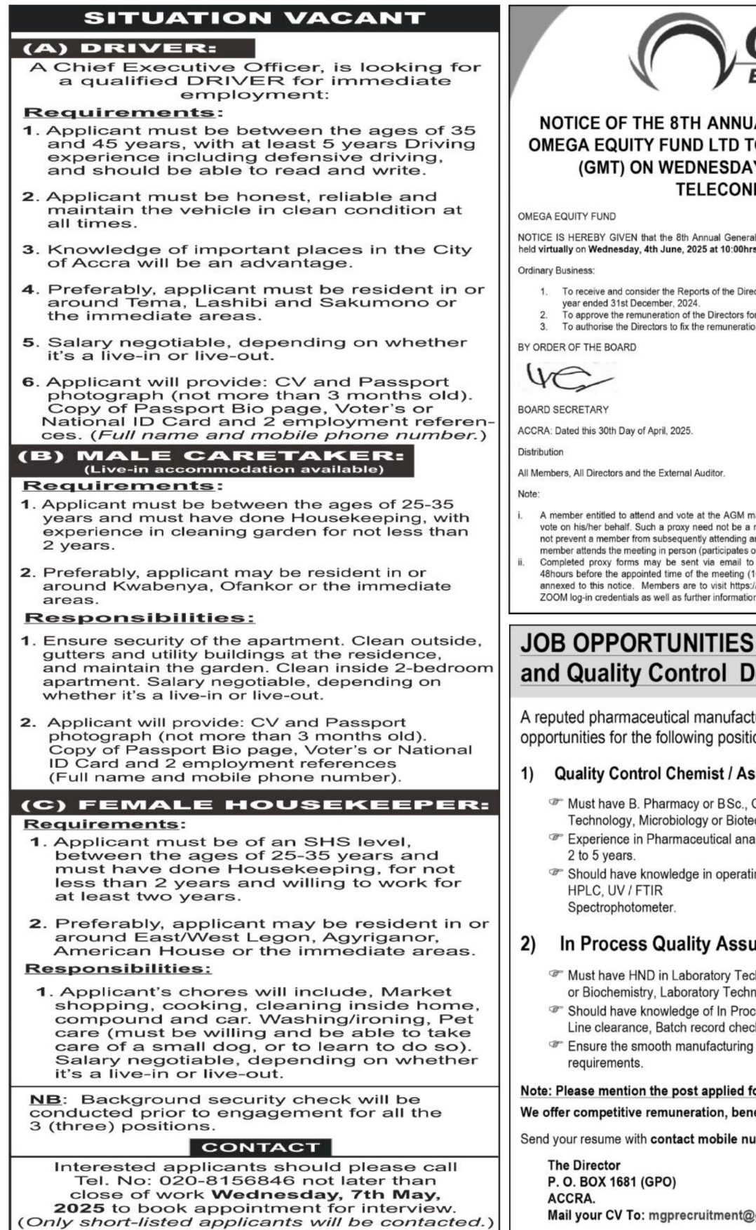 Prospective job seekers can find below the advertised jobs in the May 2, 2025, edition of the Daily Graphic as published in the paper today.