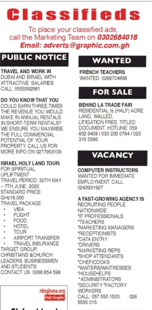 Prospective job seekers can find below the advertised jobs in the March 13, 2020 edition of Daily Graphic newspaper as published in the paper today.
