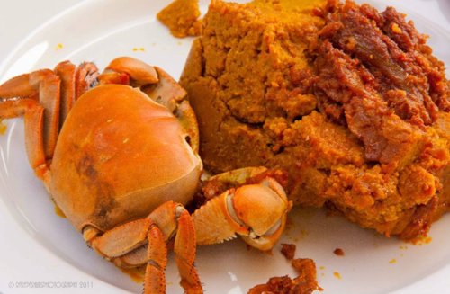 For one to prepare the sumptuous Ga-Adangbe meal, you will need palm nut soup, big crabs, salmon, onions, pepper, tomatoes, garden eggs, ginger, roasted corn flour, which will be mixed with the palm nut soup, a spatula, red beans, salt, and your seasoning spices.