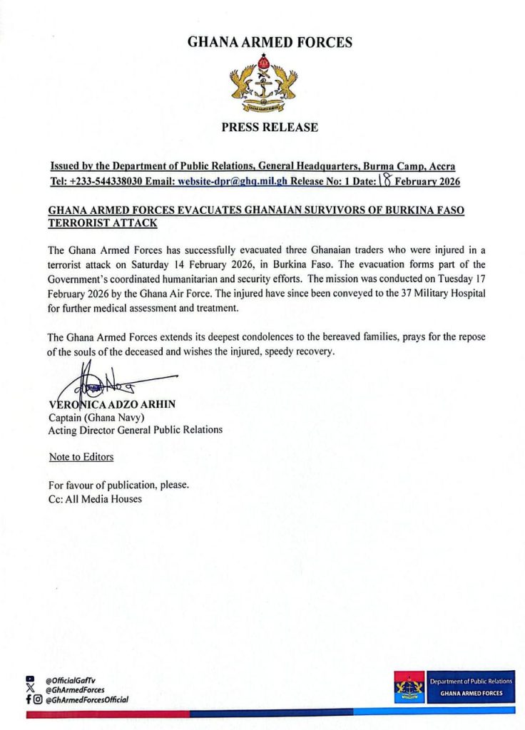 The Ghana Armed Forces has announced the successful evacuation of three Ghanaian traders who sustained injuries during a terrorist attack in Burkina Faso, as stated by the military’s Department of Public Relations.