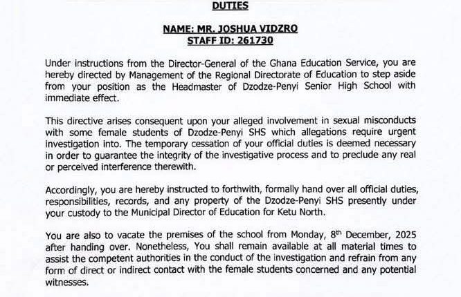 The Ghana Education Service (GES) has mandated Mr. Joshua Vidzro, the Headmaster of Dzodze-Penyi Senior High School, to immediately suspend his duties.
