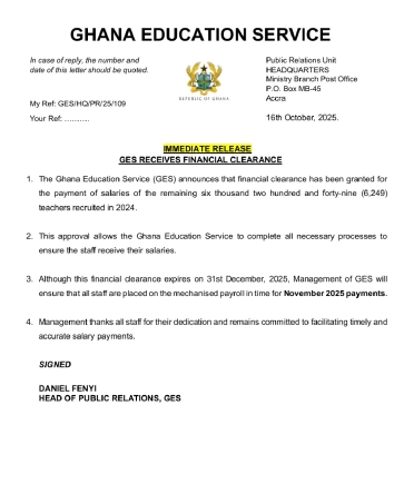 A press release dated October 16 and signed by Daniel Fenyi, the Head of Public Relations at GES, clarified that this approval will facilitate the completion of all necessary procedures to guarantee that the affected teachers receive their payments.