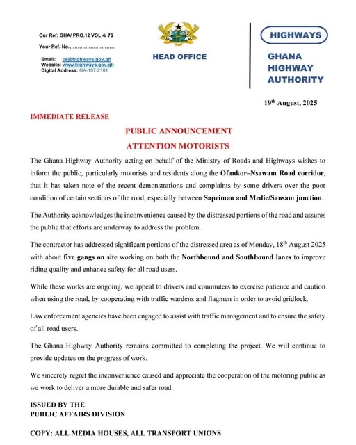 The Ghana Highway Authority (GHA), acting on behalf of the Ministry of Roads and Highways, has assured motorists and residents along the Ofankor–Nsawam road corridor that steps are being taken to address the poor condition of sections of the road.