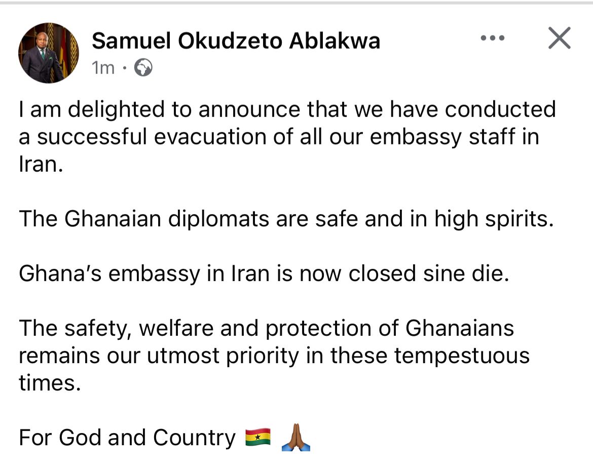 In a Facebook post on Monday, March 2, 2026, Mr. Ablakwa revealed that the evacuation operation had been finalised and that all Ghanaian diplomats are safe and in good spirits.