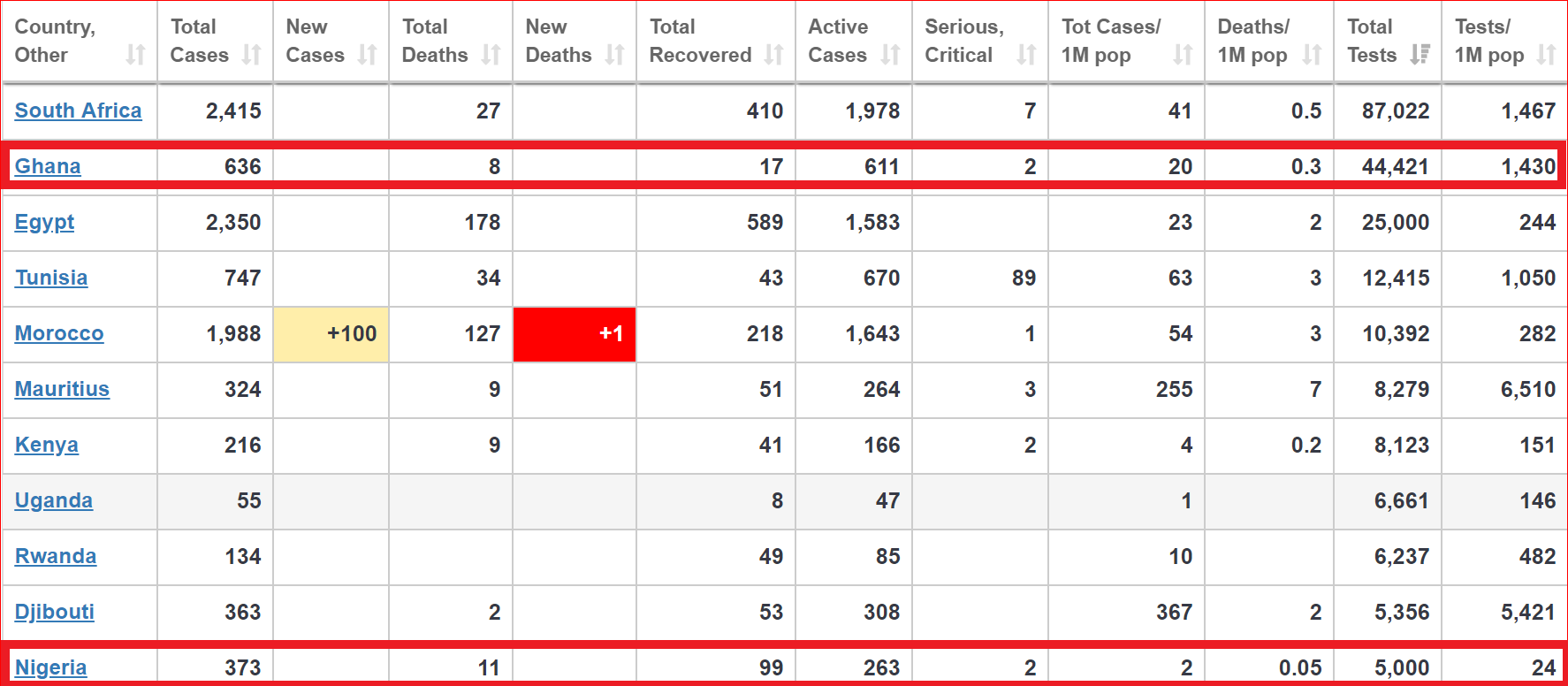 Compared to other countries, West African neighbours, Nigeria, have tested only 5,000 with 373 cases. Africa’s most populous country has registered 11 deaths and 99 recoveries.