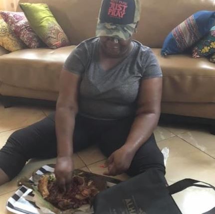 She posted a picture of herself with legs stretched out on the floor, eating waakye.