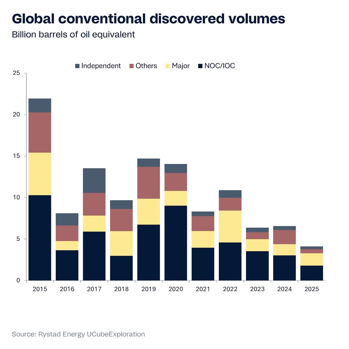 Annual conventional discovered volumes once averaged more than 20 billion barrels of oil equivalent (boe) per year in the early 2010s, but these have fallen to nearly one-third of that, with analysis by Rystad Energy showing global discoveries have averaged slightly over 8 billion boe annually since 2020 despite several standout frontier finds in Namibia, Suriname, and Guyana.