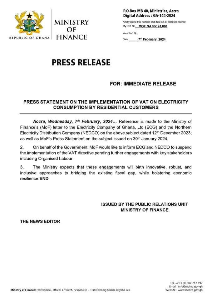 “On behalf of the Government, MoF would like to inform ECG and NEDCO to suspend the implementation of the VAT directive pending further engagement with key stakeholders, including Organised Labour.”