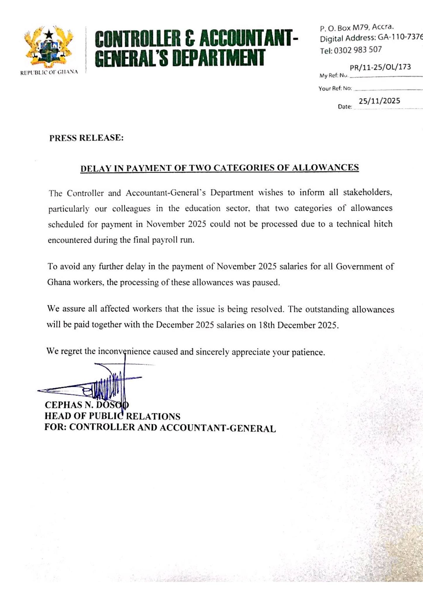 In a statement issued on Tuesday, November 25, 2025, the CAGD indicated that the processing of these allowances was temporarily halted to avoid any disruption in the payment of November 2025 salaries for all Government of Ghana employees.