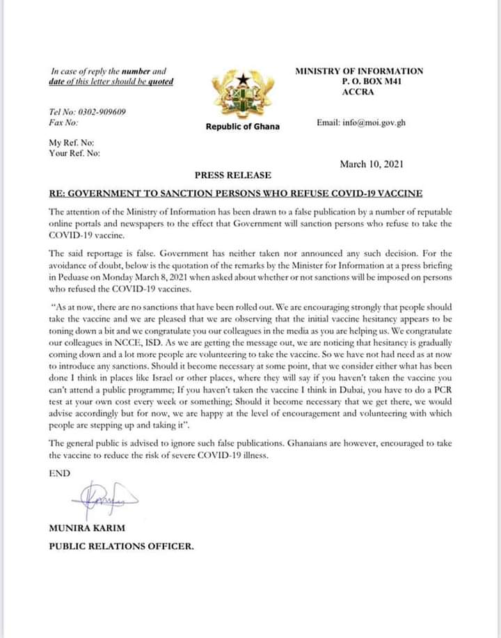 “The attention of the Ministry of Information has been drawn to false publication by a number of reputable online portals and newspapers to the effect that Government will sanction persons who refuse to take the COVID-19 vaccine.
