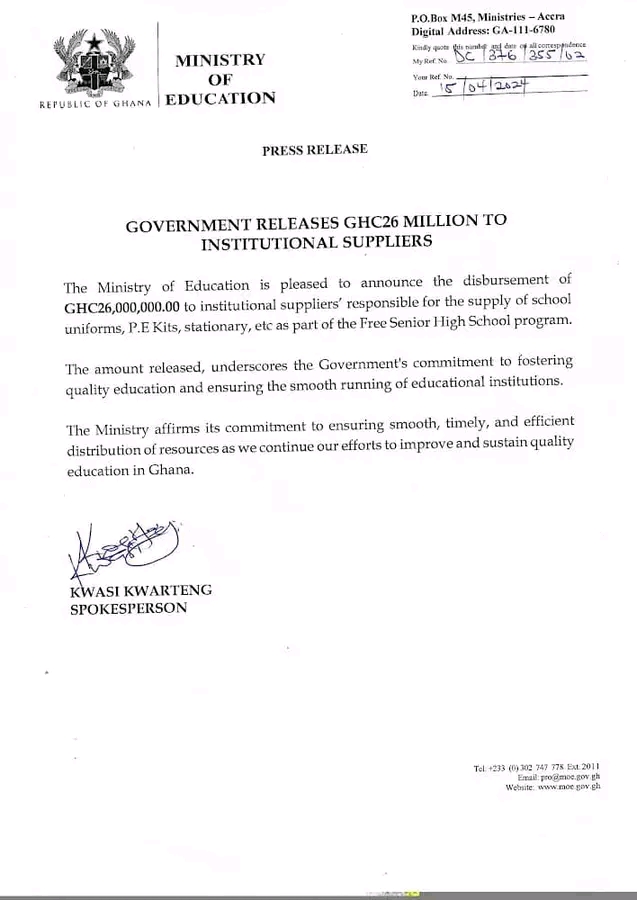 The Ministry of Education has announced the disbursement of GH¢26 million to Institutional Suppliers responsible for supplying school uniforms and other items.