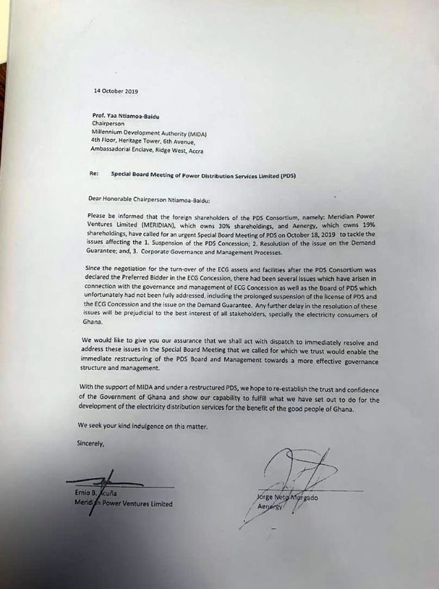 But the opposition NDC sees a sinister motive in the letter and has questioned the share of Meridian Power Ventures in PDS.