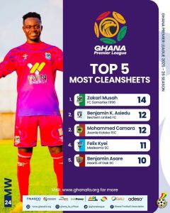The Ghana Football Association has released the current top 5 goalkeepers with the most clean sheets, and it’s FC Samartex ’s Zakari Musah who is leading the pack.