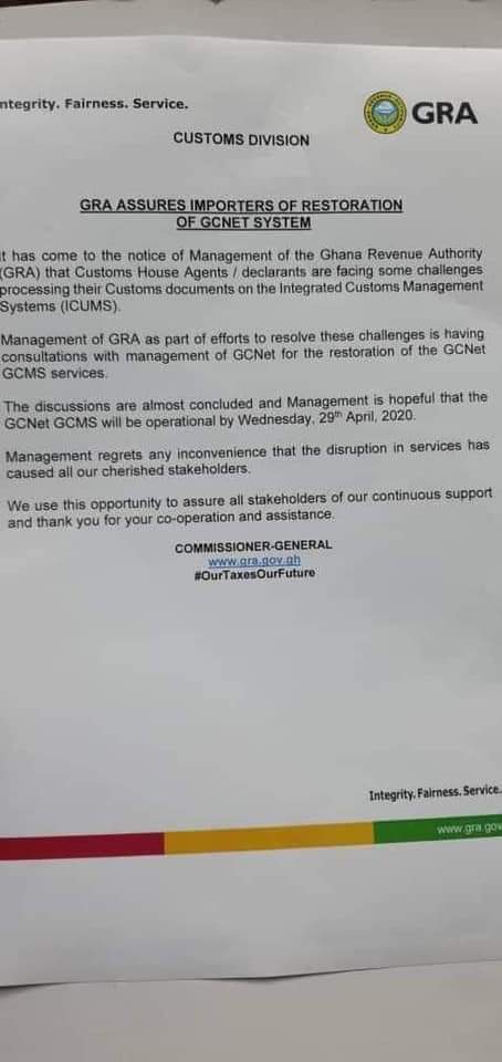“It has come to the notice of the Management of the Ghana Revenue Authority (GRA) that Customs House Agents/declarants are facing some challenges processing their Customs documents on the Integrated Customs Management Systems (ICUMS). Management of GRA as part of efforts resolve these challenges is having consultations with the management of GCNet for the restoration of the GCNet GCMS services,” it said.