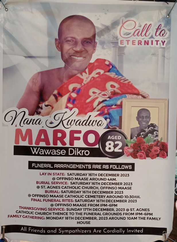 “The final funeral rites of Nana Kwadwo Marfo, the late chief of Wawase, a suburb of Offinso, came off last Saturday (December 16, 2023), where he was laid to rest and buried at Offinso Maase Roman Catholic Cemetery. The family informed us the next day that the body had been exhumed,” a close source narrated.