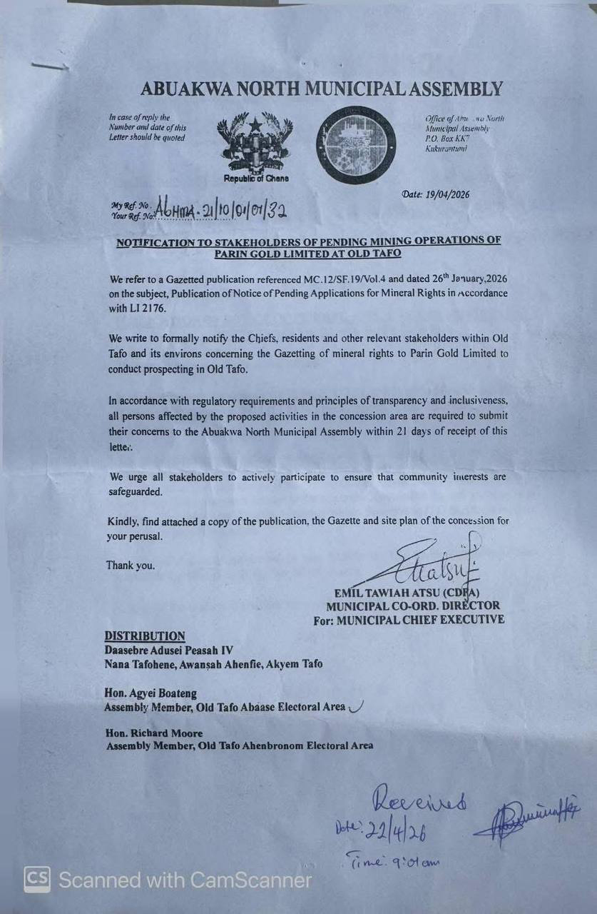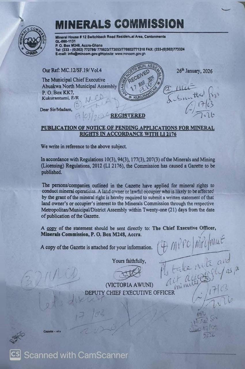 SEE LETTERS FROM THE MINERALS COMMISSION AND THE ABUAKWA NORTH MUNICIPAL ASSEMBLY ABOUT THE PLANNED MINING PROJECT: