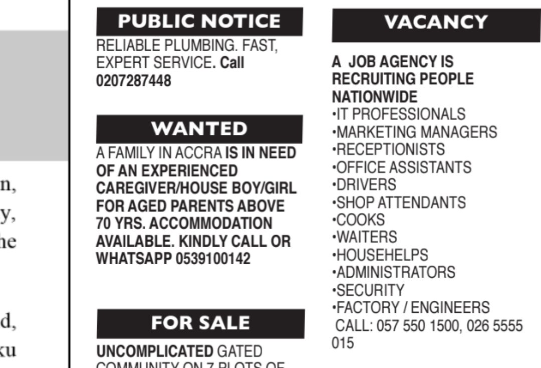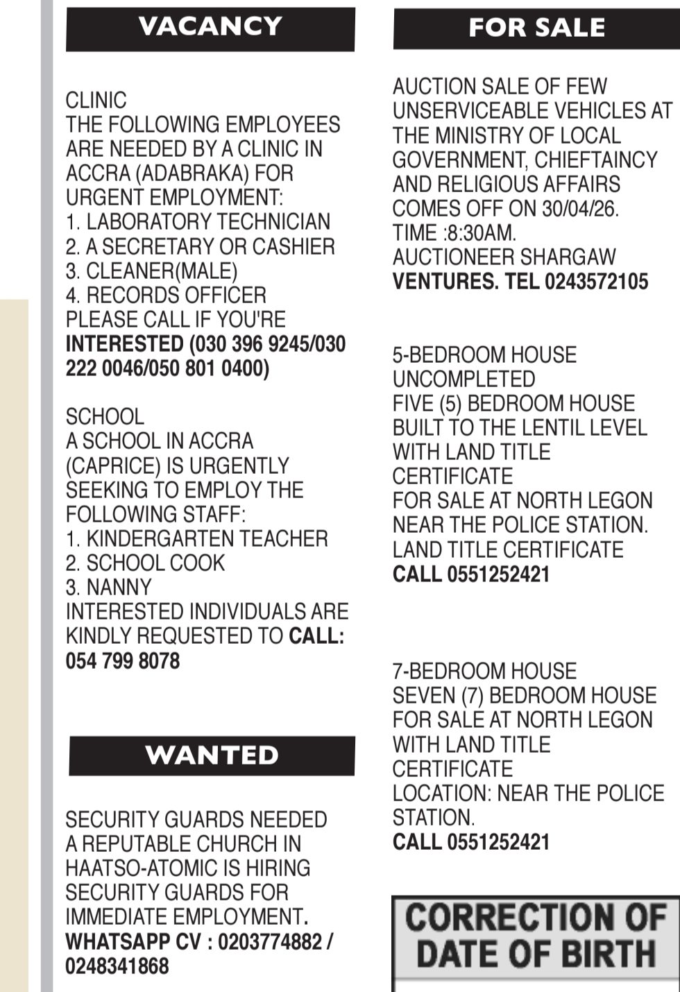 HeadlinesNews Thursday: Advertised Jobs In Newspapers Today William Agyapong 4 hours ago SHARE Prospective job seekers can find some of the advertised online jobs below as of April 23, 2026, published today. Sunyani West records 70 new cases of elephantiasis, hydrocele ECG denies overbilling claims, blames old meters OSP names five companies in petroleum import irregularities probe Who deducted security personnel rent tax? Interior Ministry clarifies Minority calls court ruling on OSP cases “complete mistake” TAGGED:Advertised jobs in newspapersJob Opportunitiesjobs today SOURCES:The Ghana Report Sign Up For Daily NewsletterBe keep up! Get the latest breaking news delivered straight to your inbox.[mc4wp_form]By signing up, you agree to our Terms of Use and acknowledge the data practices in our Privacy Policy. You may unsubscribe at any time. Share This Article Facebook Whatsapp Whatsapp LinkedIn Copy Link Print Previous Article Shut colleges if teachers can’t be employed – TTAG tells gov’t Next Article Pediatric society appeals to president over galamsey threat Leave a Comment Leave a Reply Cancel replyYour email address will not be published. Required fields are marked *Comment * Name * Email * Website Save my name, email, and website in this browser for the next time I comment. Δ Recommended Wednesday: Advertised Jobs In Newspapers Today Headlines News Dame alleges unfair rulings targeting NPP members Headlines News GTEC blacklists 62 unrecognised institutions, warns public against fake certificates Headlines News Scholarships Authority announces 2026/2027 local tertiary scheme intake Headlines News Fake spiritualist jailed three years for GH¢95k fraud Headlines News