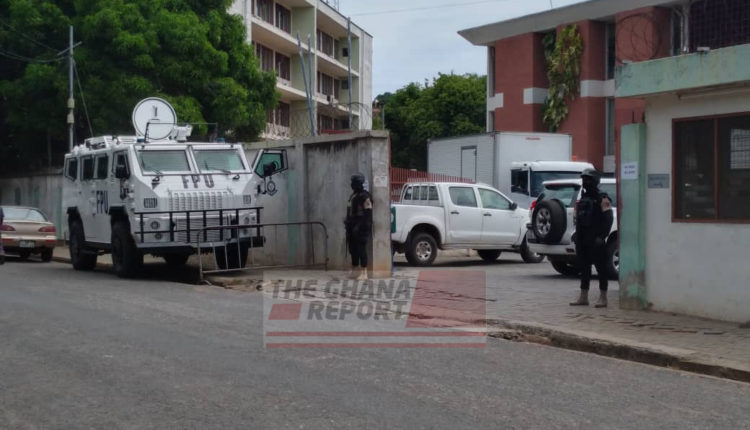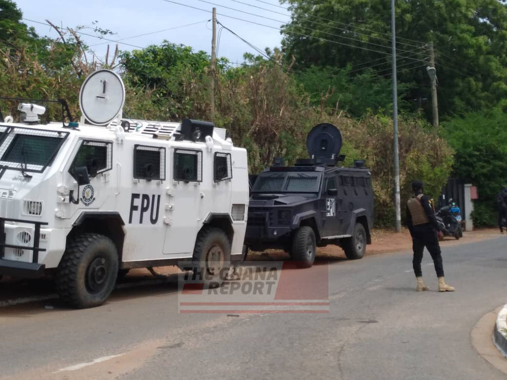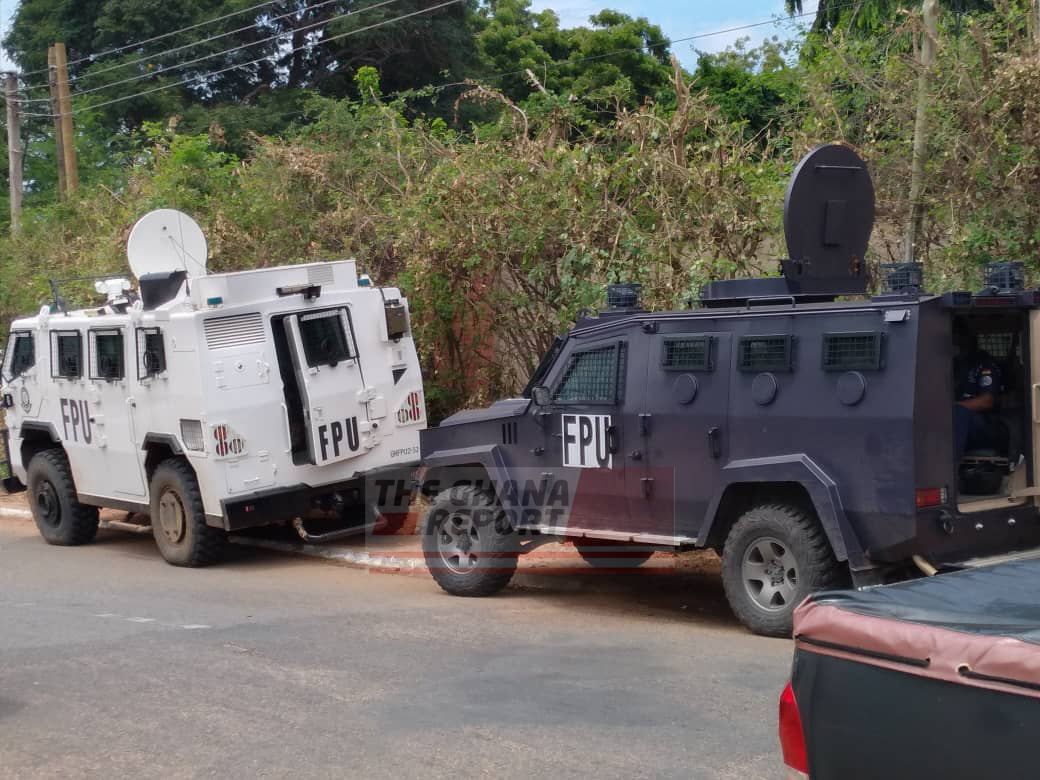 Three armoured vehicles and dozens of police personnel from the Formed Police Unit of the Ghana Police Service lined up the road leading to the entrance of the commission to ward off trouble makers.