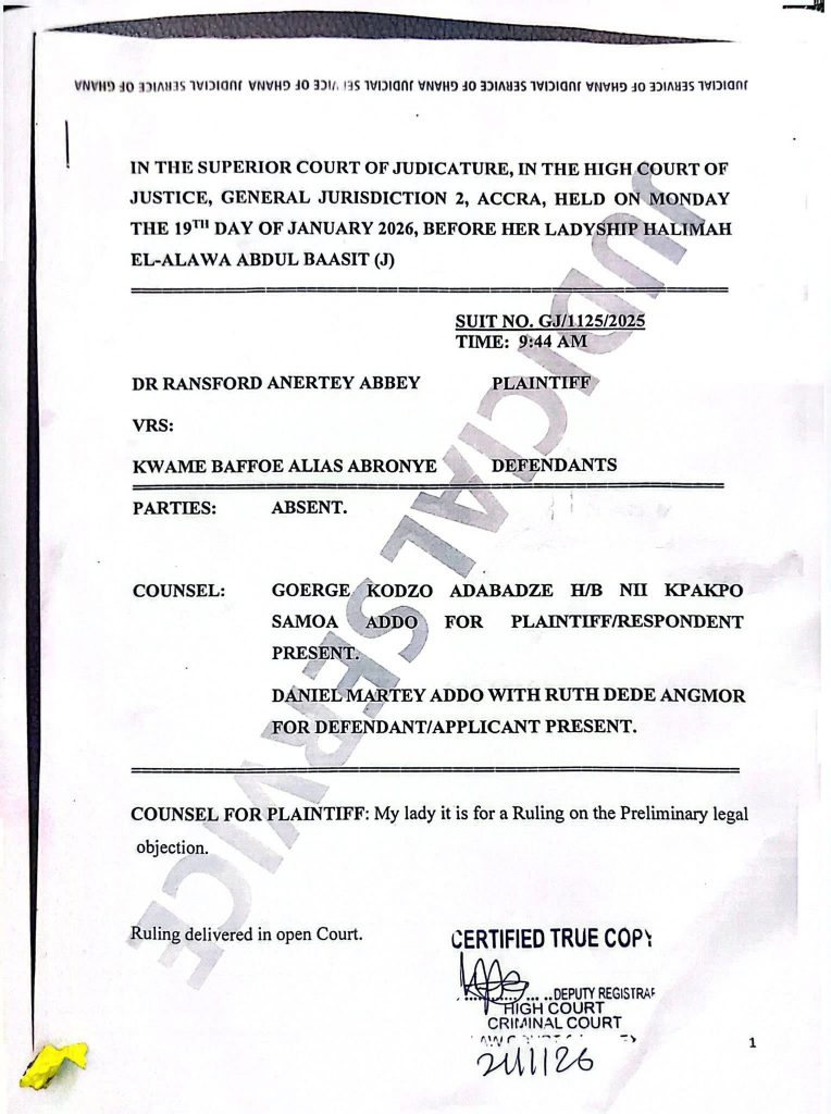 The decision was rendered on Monday, January 19, 2026, by Justice Halimah El-Alawa Abdul Baasit at the High Court, General Jurisdiction 2, located in Accra.
