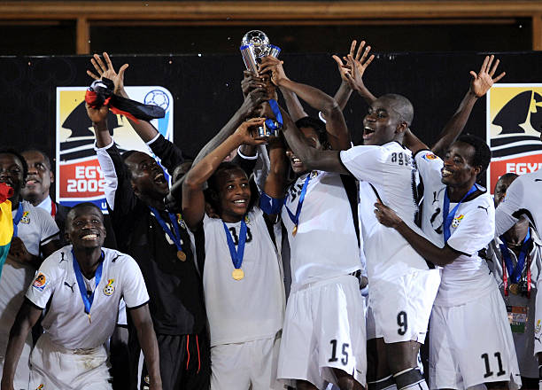 Ghana captain Andre Ayew holds up the trophy with team-mates during the FIFA U20 World Final match between Ghana and Brazil at the Cairo International Stadium on October 16, 2009 in Cairo, Egypt. (Photo by Shaun Botterill – FIFA/FIFA via Getty Images)
