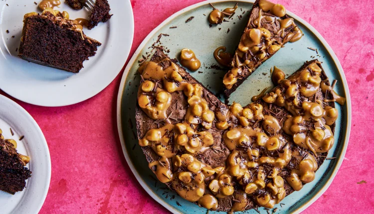 Carefully transfer the cake to a plate and decorate with some shavings of chocolate. Serve it with either whipped cream or crème fraîche. It’s best to dip the blade of the knife you’re using to cut the cake into boiling water – that way you’ll be able to slice through the caramel more easily.