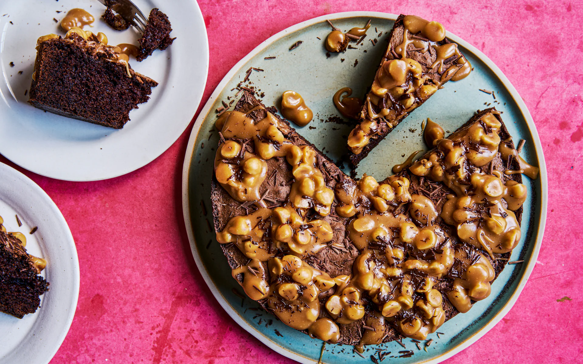 Beat 150g soft light-brown sugar and 3 large eggs together with an electric mixer until pale and increased in volume. Whisk in the melted chocolate and butter, then 1 tsp vanilla extract. Quickly fold in 130g plain flour, 1 tsp bicarbonate of soda and a good pinch of salt, being careful not to overmix. Scrape the batter into the prepared tin and bake for 40-45 minutes. A skewer inserted into the middle of the cake should come out clean.