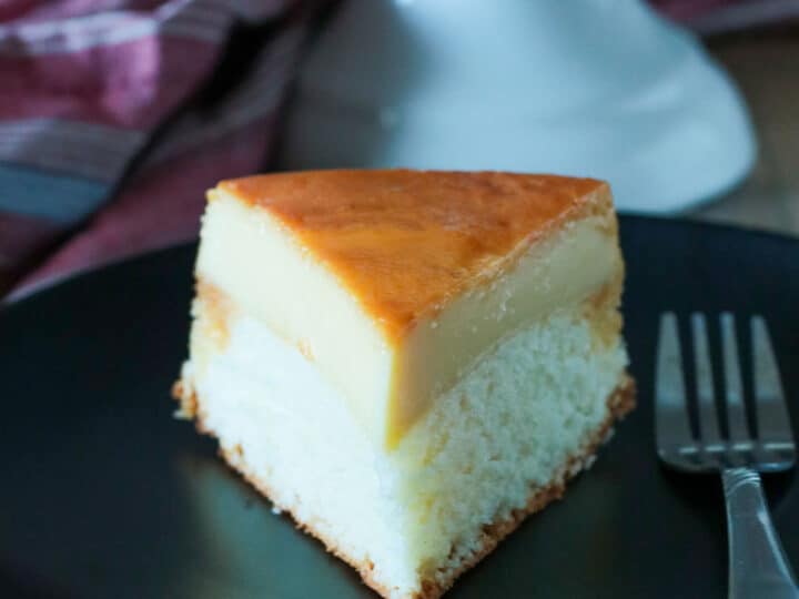 - Slowly pour the cake batter over the custard mixture in the cake pan. The batter will float on top of the custard.