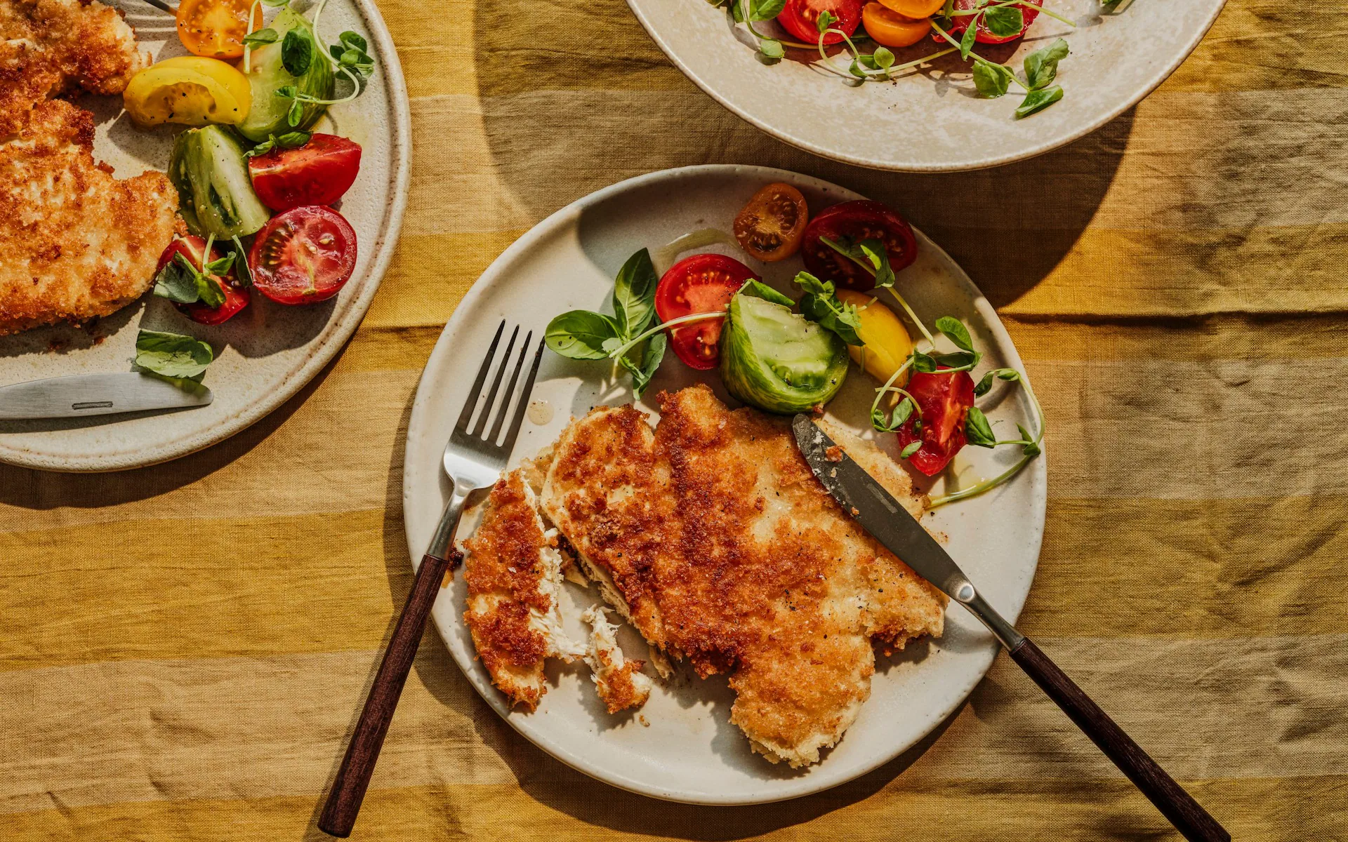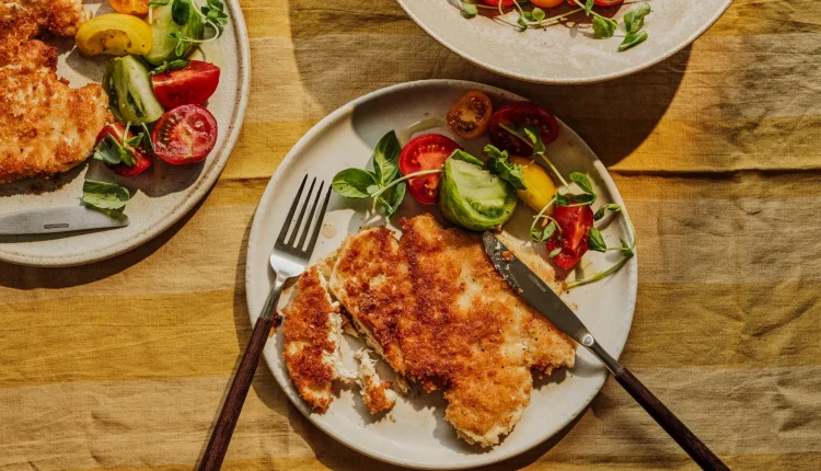 Heat 2 tbsp olive oil and 10g butter in a large pan set over a medium heat. Cook two of the pieces of chicken for about 3 minutes on one side, then turn them over to cook for another 3 minutes. You will probably have to adjust the heat – the coating should be crunchy and golden but it shouldn’t get too dark in colour before the chicken is cooked through.