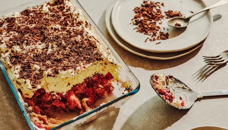 Spoon this mixture on top of the raspberries. Cover the dish and put it in the fridge. It’s best to leave it overnight – a bit like a trifle, it improves.