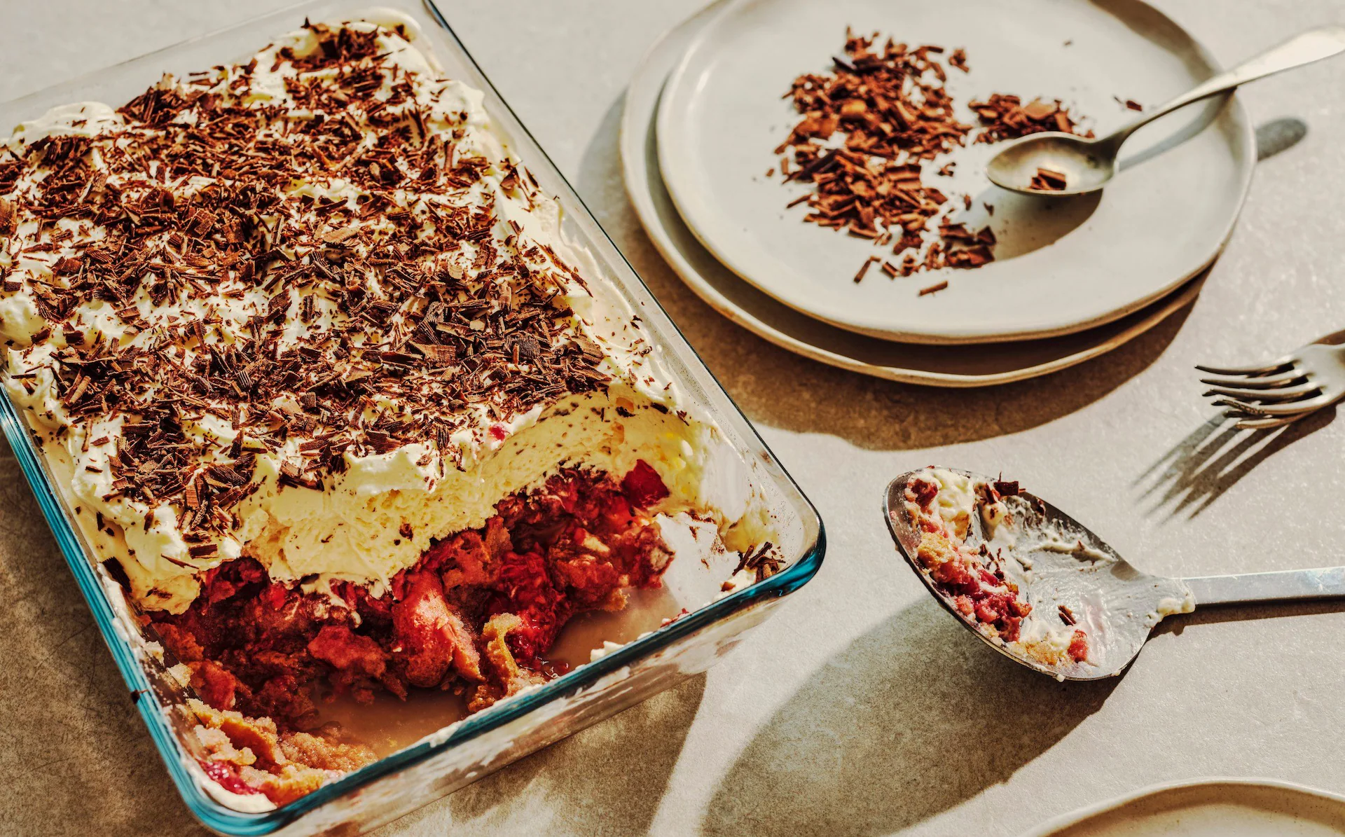 Lightly crush 375g raspberries and spread them over the sponge fingers. Sift 5g of the cocoa powder on top. Cover and return to the fridge.