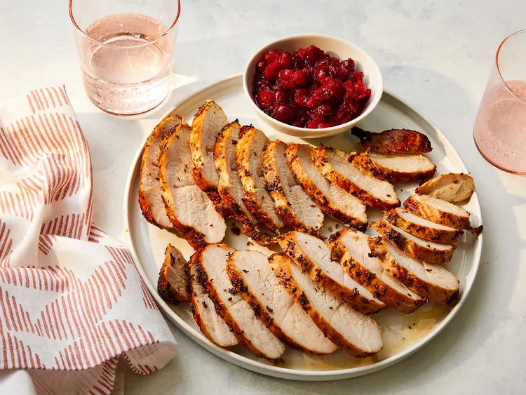 ![Sliced Turkey Tenderloins on a platter next to cranberry sauce in a bowl]()