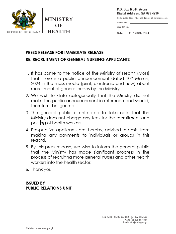 “It has come to the notice of the Ministry of Health (MoH) that there is a public announcement dated 10th March 2024 in the mass media (print, electronic, and new) about the recruitment of general nurses by the Ministry.