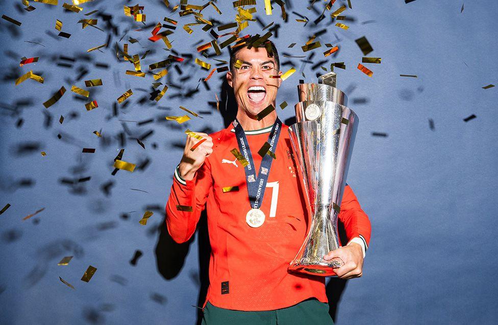 Cristiano Ronaldo poses for a photo with the UEFA Nations League trophy after the UEFA Nations League Final between Spain and Portugal. Photo by Sebastian Widmann