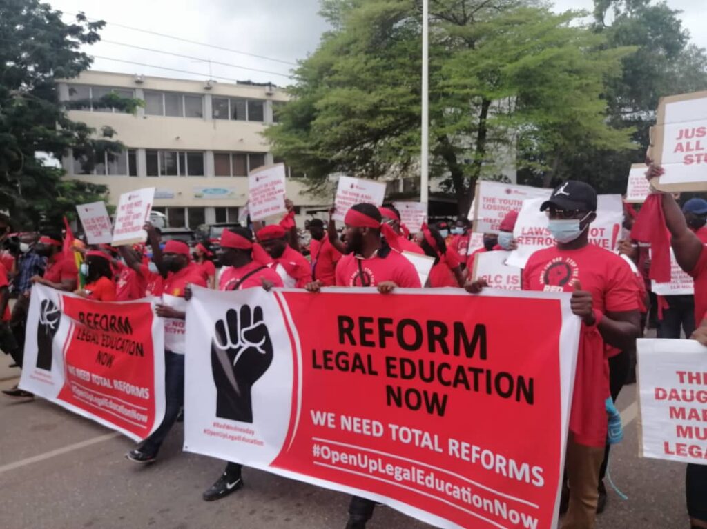 The protest organised by the National Association of Law Students (NALS) dubbed ‘Red Wednesday’, accused the General Legal Council (GLC) of intentionally failing a chunk of the candidates because of a new quota system.