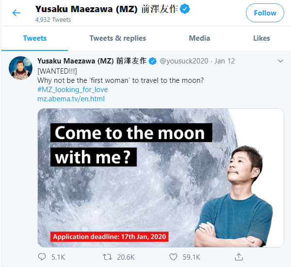 Why not be the ‘first woman’ to travel to the moon?#MZ_looking_for_love https://t.co/R5VEMXwggl pic.twitter.com/mK6fIJDeiv— Yusaku Maezawa (MZ) 前澤友作 (@yousuck2020) January 12, 2020