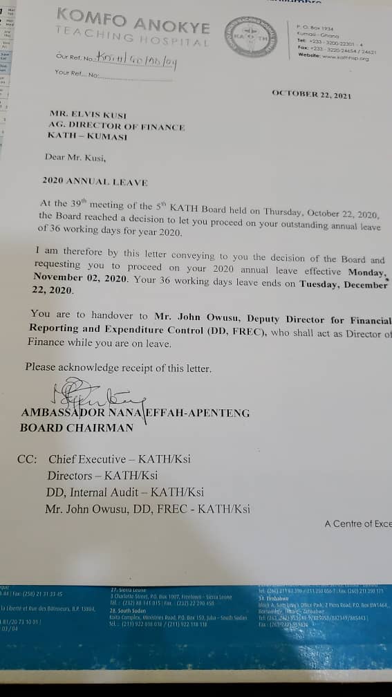 The Director of Finance at the Komfo Anokye Teaching Hospital (KATH) in Kumasi, Elvis Kusi, has sued the hospital for advertising his job while he is on leave.