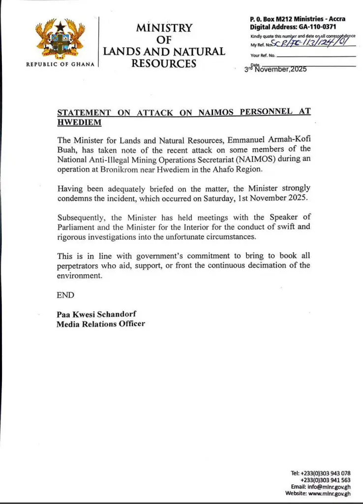 As reported by the Ministry, the incident took place on Saturday, 1st November 2025, while NAIMOS officers were engaged in an anti-galamsey operation.