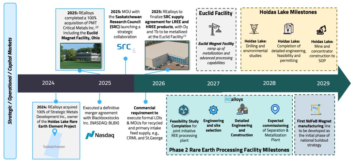 They have an executed commercial processing and long-term offtake agreement with the Saskatchewan Research Council (SRC) tied to SRC’s Rare Earth Processing Facility in Saskatoon. Under that agreement, REalloys (NASDAQ: ALOY) secures 80% of annual production from the upgraded capacity, with supply structured on a cost-plus model. Heavy rare earth production from the upgraded facility is expected to begin in early 2027, positioning REalloys as the only commercial-scale supplier of dysprosium and terbium oxides in North America.