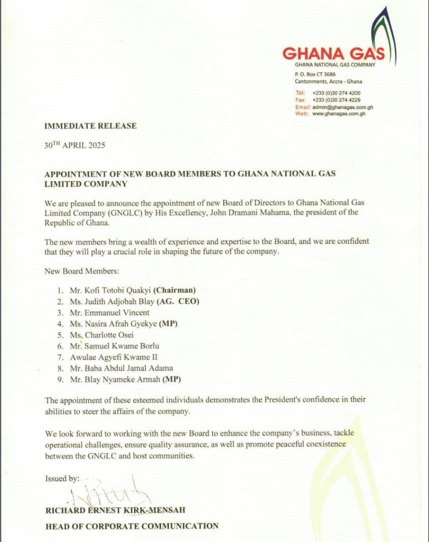 In a statement, Ghana Gas said the appointments reflect the President’s confidence in the new board’s ability to lead the company effectively.