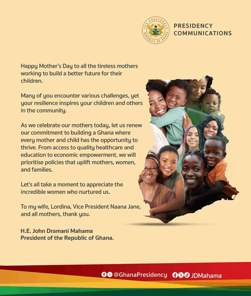 “As we celebrate our mothers today, let us renew our commitment to building a Ghana where every mother and child has the opportunity to thrive,” the statement read.