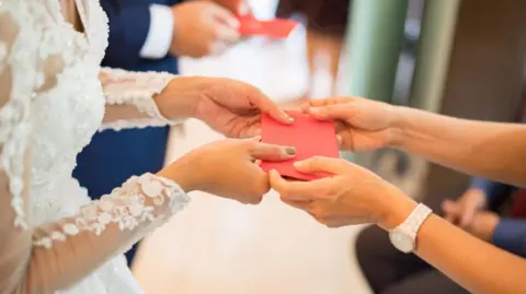 In many Asian cultures, wedding guests typically give newlyweds money, usually in red envelopes, as a sign of good luck.