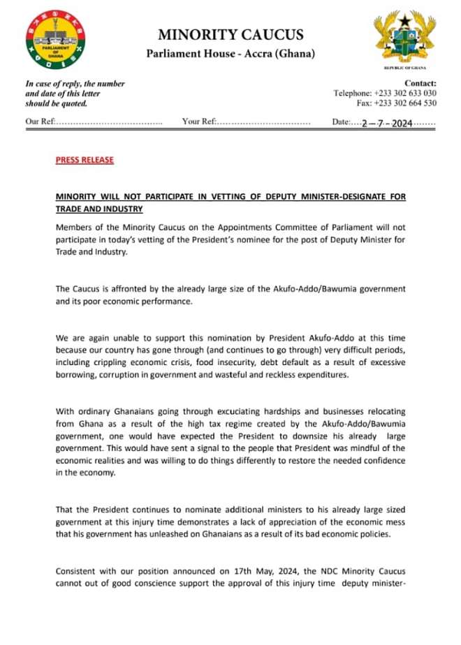 Members of the Minority Caucus on the Appointments Committee of Parliament have boycotted the vetting of the Deputy Minister-designate for Trade and Industry, Kofi Ahenkorah Marfo.