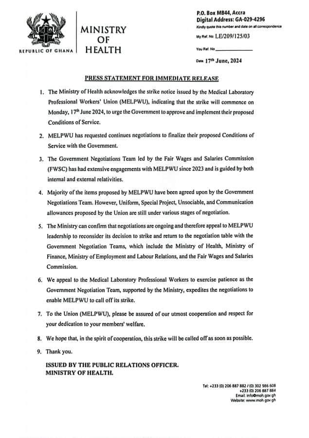 The Ministry of Health has appealed to the Medical Laboratory Professional Workers’ Union (MELPWU) to call off their industrial strike, which commenced on Monday, June 17, 2024.