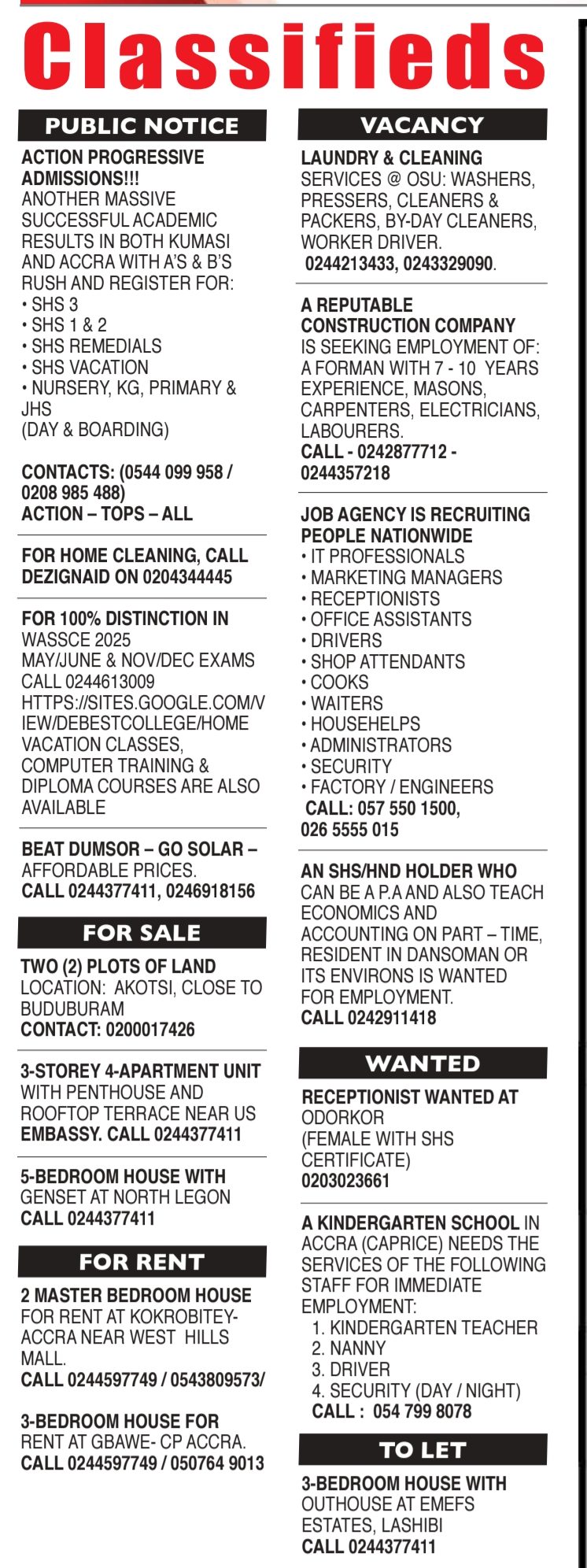 Prospective job seekers can find below the advertised jobs in the January 20, 2025 edition of Daily Graphic as published in the paper today.