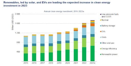 According to Fatih Birol, the IEA’s executive director, solar investments are expected to attract over $1 billion a day in 2023 with over $1.7 trillion slated to flow clean energy technologies such as EVs, renewables and storage. Overall, global investment in energy is projected to hit ~$2.8 trillion in the current year.