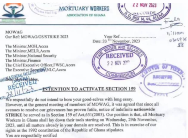 The Mortuary Workers Association of Ghana has announced that their intention to begin a nationwide strike on November 29, 2023.