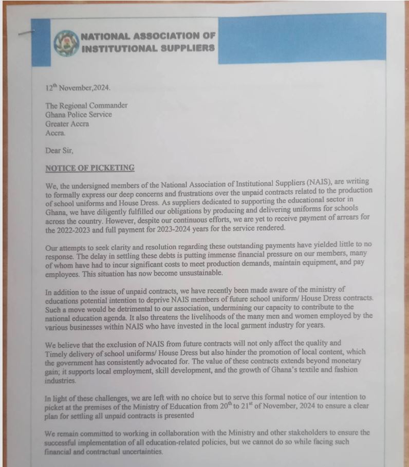 The association, in a statement addressed to the Regional Commander of the Ghana Police Service in Accra on November 12, 2024, expressed its frustration over outstanding payments related to the supply of school uniforms and house dresses.