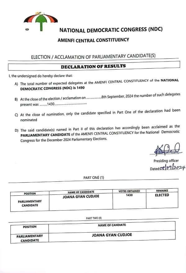 The National Executive Committee of the party in a brief statement confirming her nomination indicated that Joana Gyan Cudjoe was elected through acclamation after the incumbent Member of Parliament (MP) and her contender, Peter Yaw Kwakye Ackah withdrew from the race after vetting on Saturday, September 7, 2024.